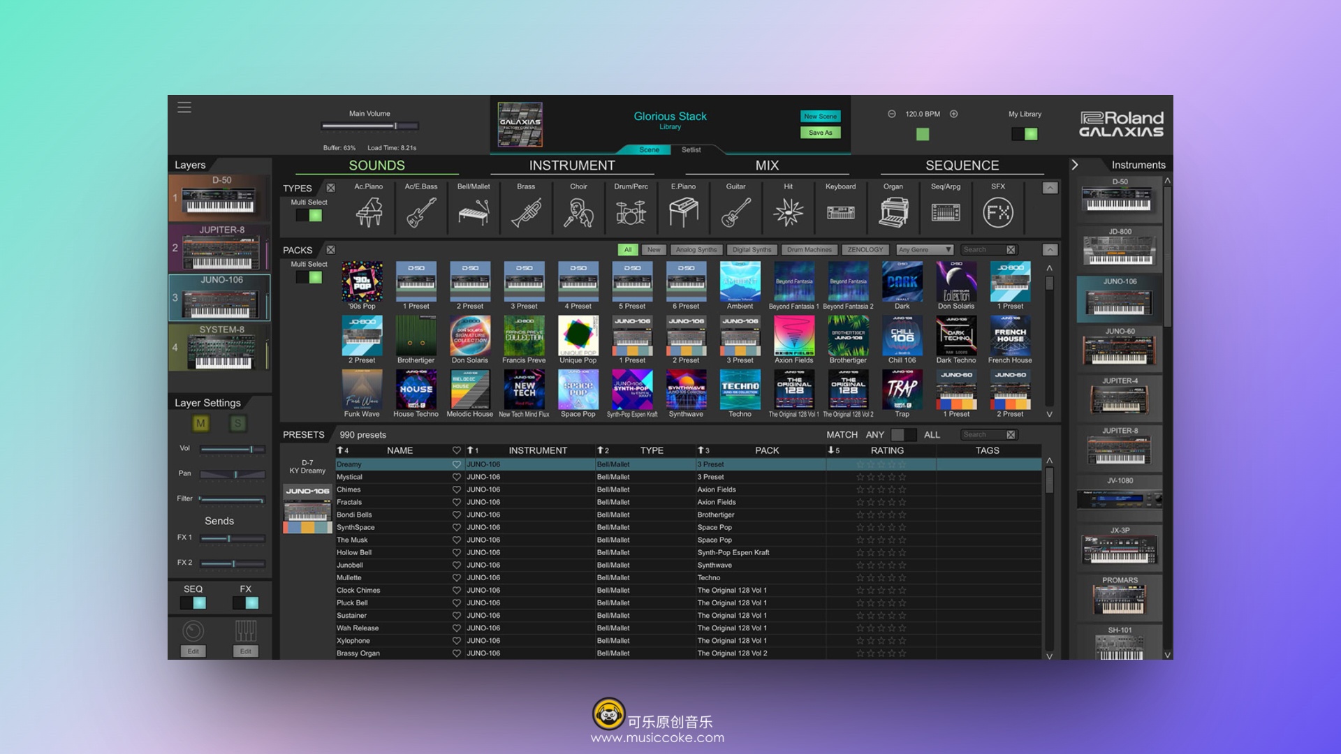 自由结合从复古到现代的正宗Roland乐器。探索超大GALAXIAS场景,充满复杂层次和深厚的宏控控制的超级乐器